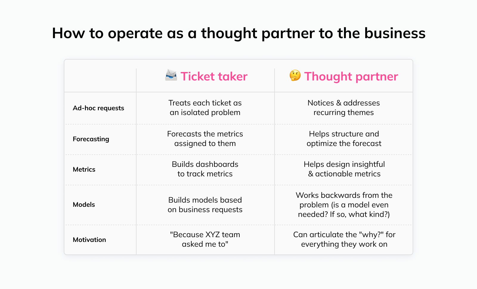 To address these issues, a data team must evolve from a reactive ticket taker to a proactive thought partner.