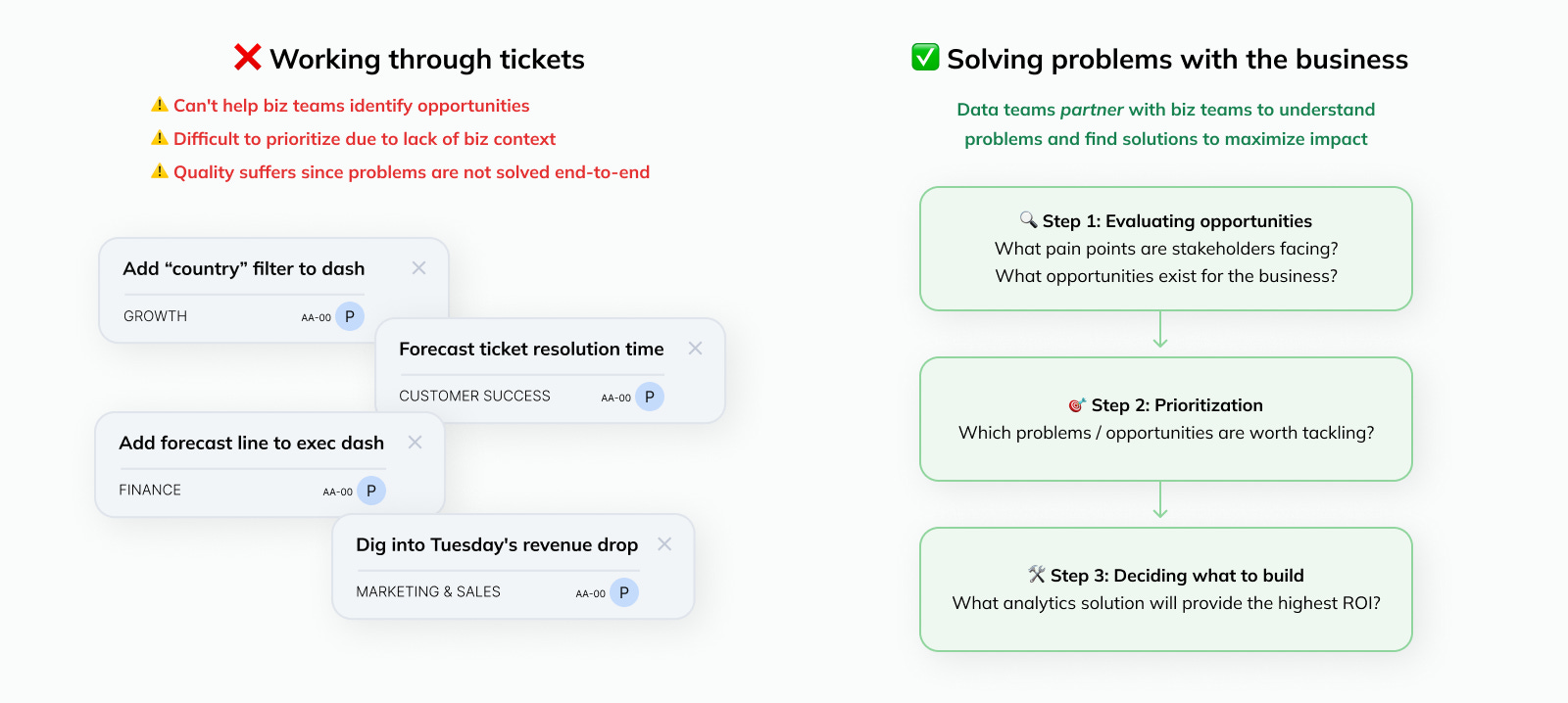 These issues all stem from the fact that in a ticket-taker model, business stakeholders assign tasks to the data team instead of asking them to solve problems.