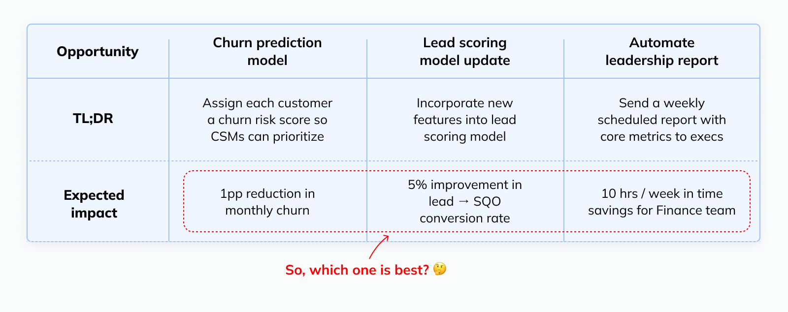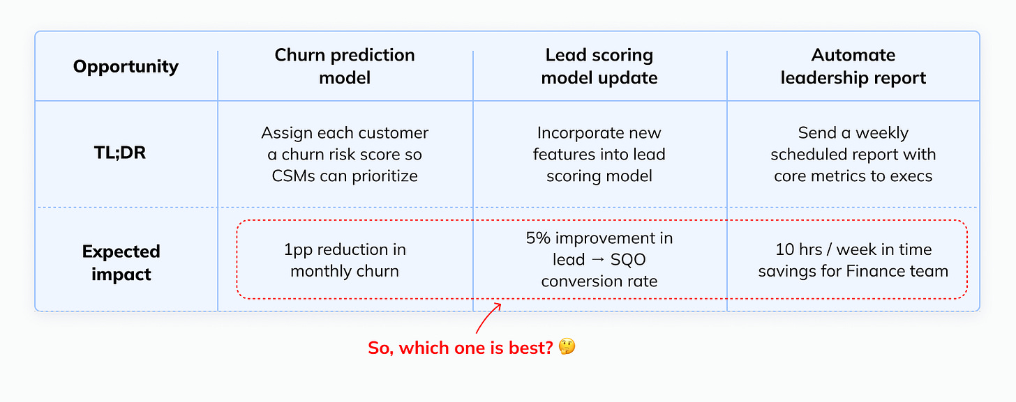 ➡️ The Sales team overestimated what was required to solve their problem. By scoping the solution together with them, you were able to find a simple fix and avoided spending weeks on a model that wasn’t needed.