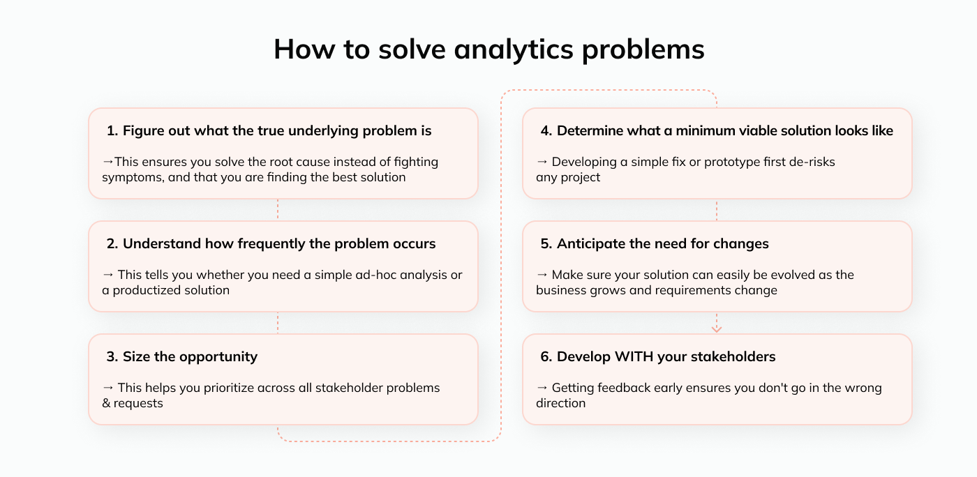 Issue #2: The business gets lower-quality analytics solutions since the data team is tackling individual tickets instead of solving a problem end-to-end. Business stakeholders start viewing the data team as a service desk for data pulls and are less likely to involve it when it comes to solving more strategic problems