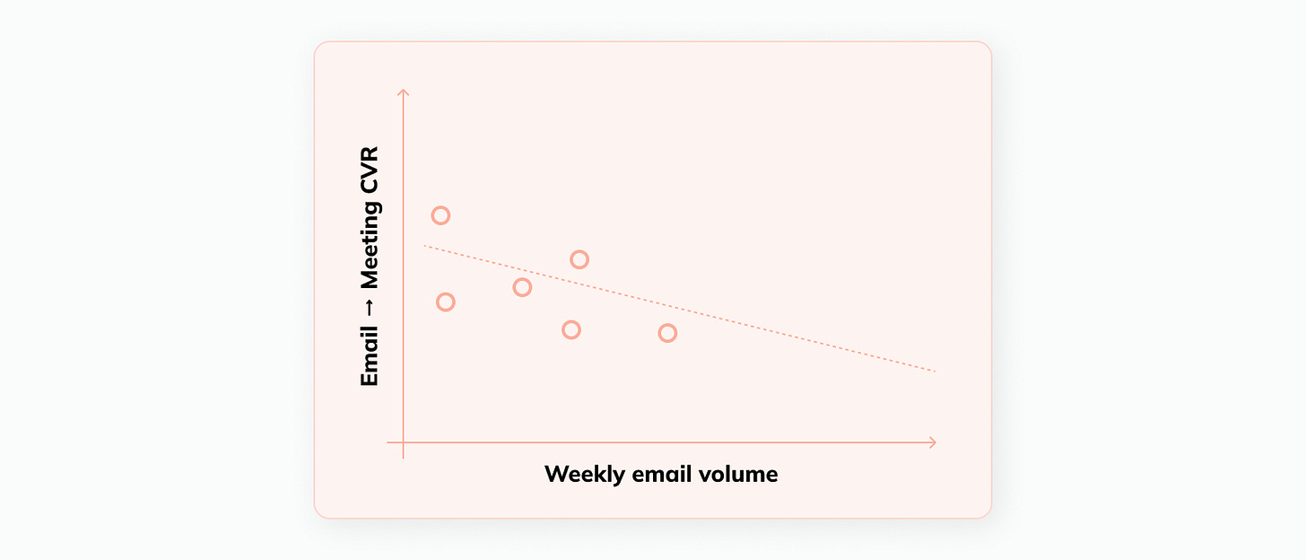 You might not have experimental data for this particular change, but chances are that email volume fluctuated substantially in the past. To get a rough idea of how incremental volume might convert to meetings booked, you can plot these data points and see if there is a meaningful relationship. If it’s linear enough, you can keep things simple and assume it’s linear for the purpose of this directional exercise:
