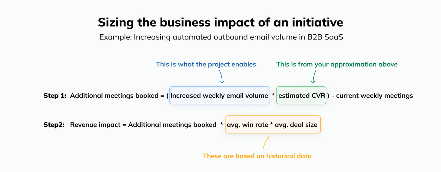Based on this simple approximation, you can estimate how your conversion rate will change and how many incremental meetings you can expect to book. You then just need to apply a few assumptions (win rate, average contract size) to get a revenue estimate and compare it against other initiatives.