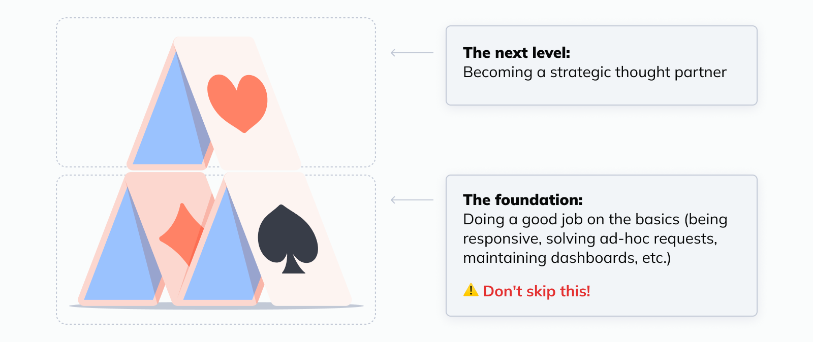 In other words, becoming a strategic thought partner doesn’t mean that you’ll stop working on ad-hoc requests or recurring tasks; it just means that you start engaging with your stakeholders earlier in the process so that you can together scope better analytics solutions (and eliminate some of the low-impact tickets).