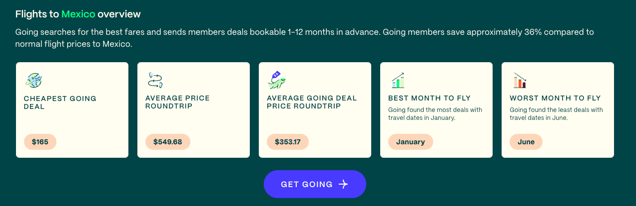 This works for the same reasons as Zillow’s Zestimate above; 1) this data-backed overview is the direct answer to common search queries like “best times to fly to mexico”, 2) it doesn’t require any complex inputs or configuration, and 3) it converts visitors to registered users as the next logical step is to sign up for a Going account and set price alerts.