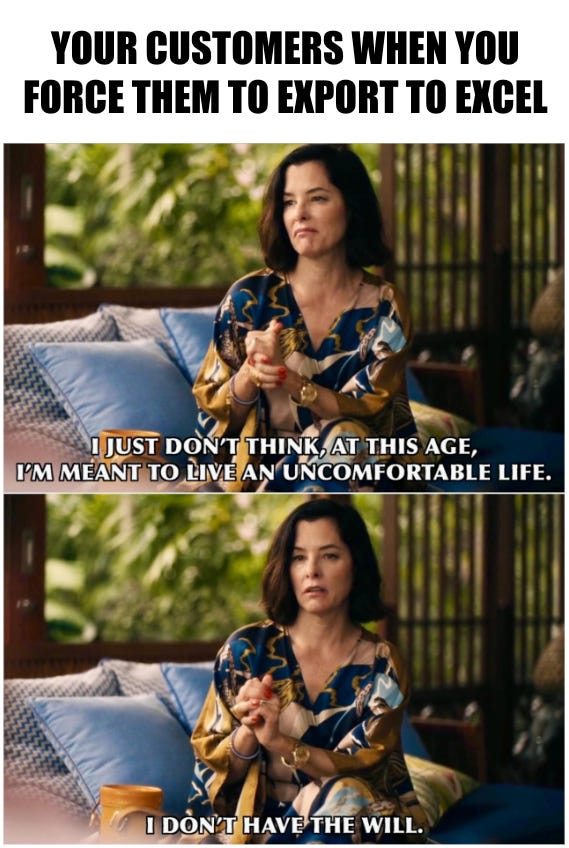 But the value goes far beyond this. Regardless of what your product does, users will inevitably reach a point where they need to dig into the data. Without built-in analytics, they’ll export data into Excel and/or use third-party tools that have the capabilities you’re missing. Either way, they’ll spend less time in your product. And over time, missing features and workarounds start to impact retention.