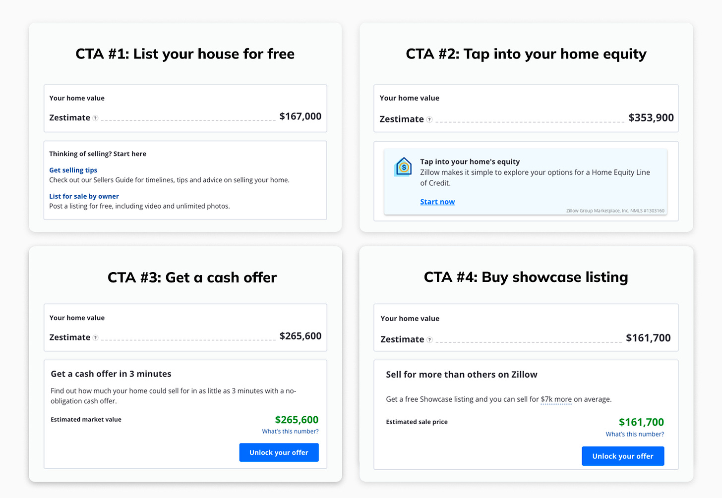 Conversion: Depending on the status and location of the house, you’ll be presented with one of these four Calls-to-Action (CTAs), asking you to either 1) list your home, 2) take out a loan, 3) request a cash offer for your house, 4) or pay for a featured listing. Each CTA directly converts you into a user of one of Zillow’s core product lines.