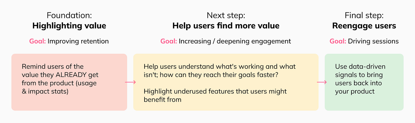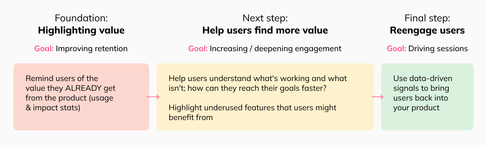 Combined with push notification and/or emails, you can also create a powerful re-engagement loop that leverages analytics signals to draw users back into the product and drive sessions.