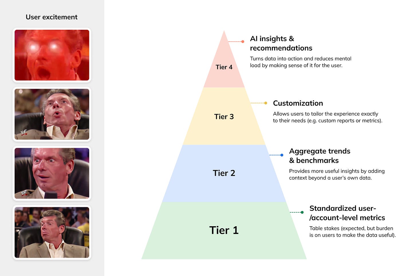 Going back to our hierarchy from earlier, this means that it usually makes sense to offer Tier 1 and potentially Tier 2 insights to everyone while reserving Tier 3 and/or Tier 4 for premium tiers.